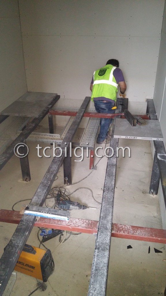 Sistem odası için yanmaz alçıpandan duvar uygulaması, kablolama için tava uygulaması, yükseltilmiş döşeme uygulaması, yangın algılama ve gazlısöndürme uygulaması, yangına dayanıklı kapı uygulaması, sistem odasına giriş için parmak izi cihazına ait örnek bir çalışma.